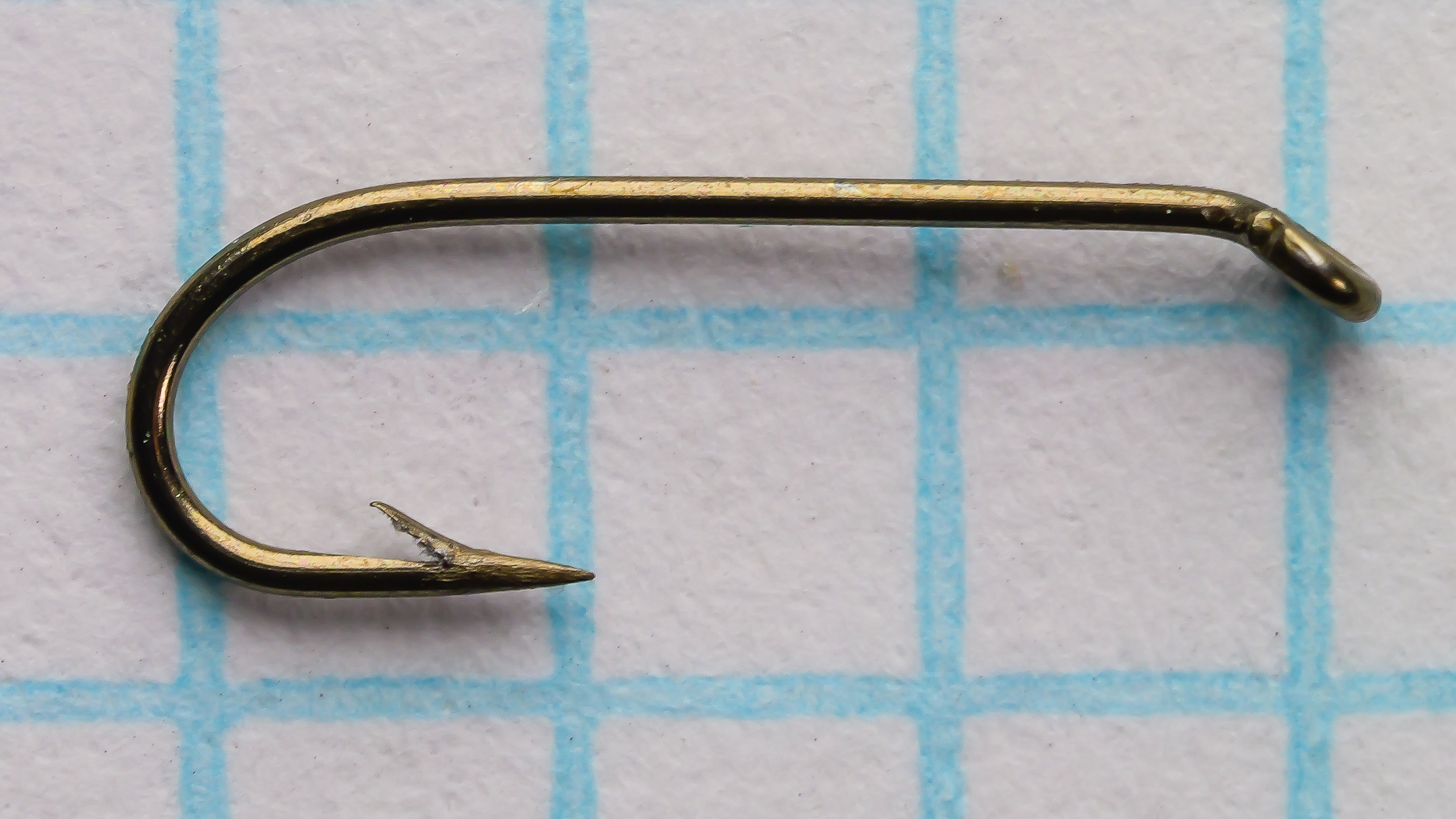 | Eye | Down-turned loop eye — the standard down eye documented across the Bramley-era fly hook range; consistent with the L3A and L2A’s down eye orientation; for dry fly fishing, the down eye’s orientation angles the tippet attachment slightly downward from the shank, which has a minimal effect on the fly’s position in the surface film at size 20 where the eye’s absolute dimensions are very small |