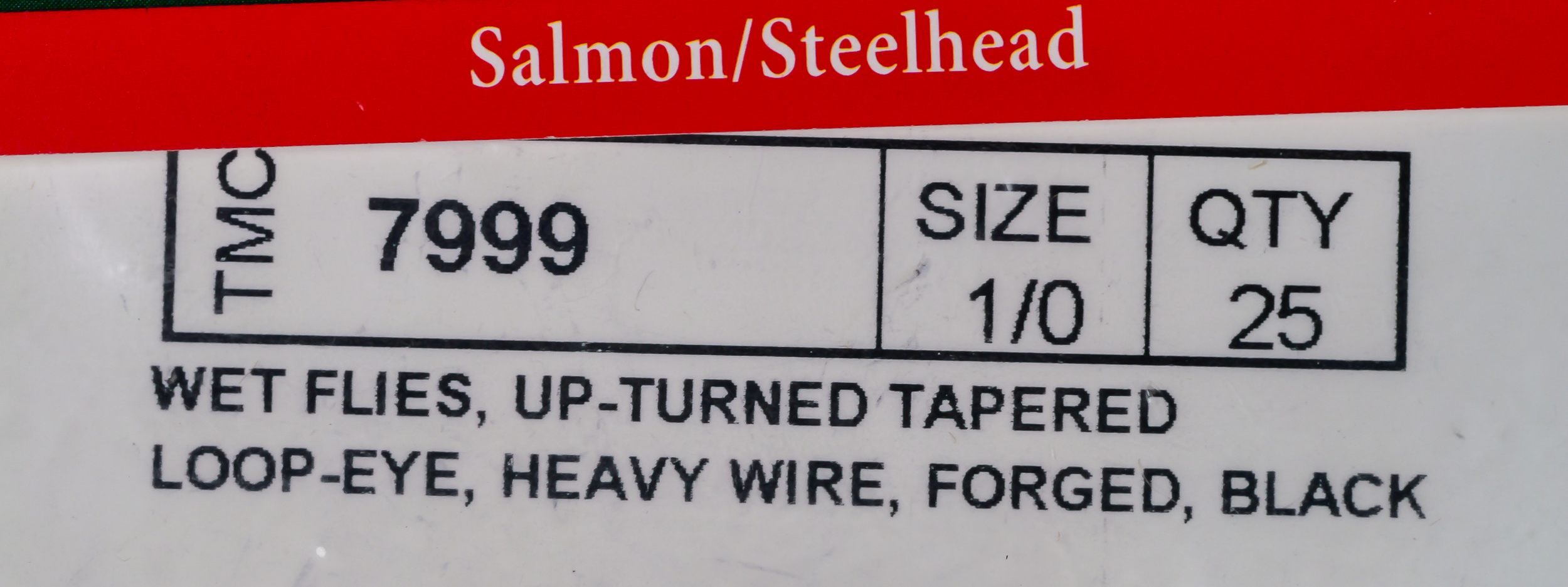 The TMC 7999 is a heavy-wire, forged salmon iron with a traditional black finish. It features a tapered, up-turned loop eye designed to facilitate small thread heads. The bend creates a wide gape relative to the shank, utilizing a modified Limerick curve for optimal holding power. The point is chemically sharpened with a low-profile barb.